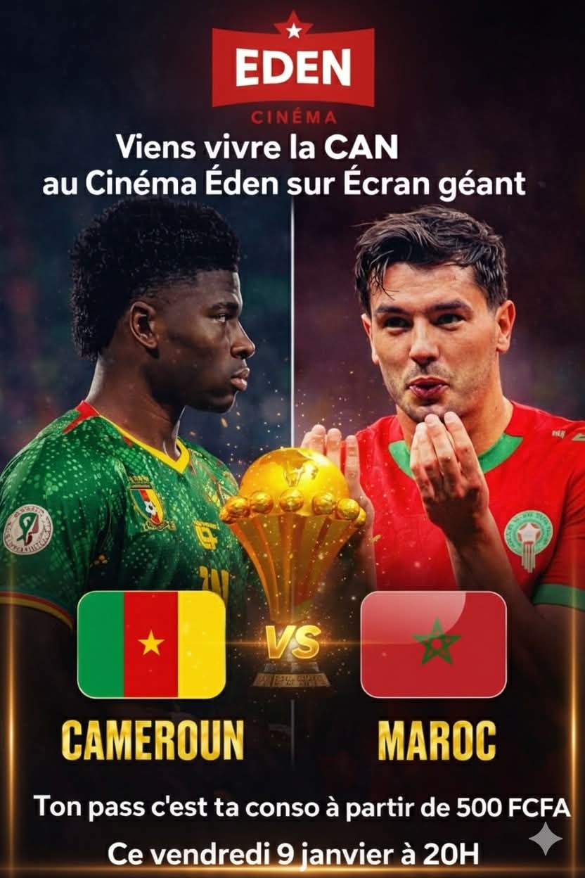 Le Cameroun affrontera le Maroc en quarts de finale demain vendredi 9 janvier 2026 à 20h00. Cinéma Eden, situé à Besseke à Douala, annonce la projection de cette rencontre de la Coupe d’Afrique des nations (CAN) sur écran géant. Toutefois, l’une des plus anciennes salles de cinéma de la capitale économique camerounaise pose une seule condition pour y avoir accès : « Ta conso à partir de 500 FCFA c’est ton pass« .