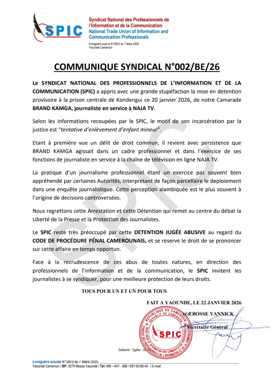 Le communiqué n°002/BE/26 signé de Yannick Ebosse, secrétaire général de cette organisation syndicale, est assez clair. Si la consternation suite à l’arrestation suivie de la mise en détention à la prison centrale de Kondengui à Yaoundé le 20 janvier 2026, de Brand Kamga, journaliste en service à Naja TV, reste de mise, il transparaît tout de même assez de zones d’ombres quant au motif accolé sur son dossier, à savoir : « tentative d’enlèvement d’enfant mineur ». Car pour un motif d’une aussi grande teneur, les sources judiciaires auraient pu être un peu plus précises. Ce d’autant plus qu’il ressort aussi que Brand Kamga était dans l’exercice de ses fonctions dans le cadre professionnel.