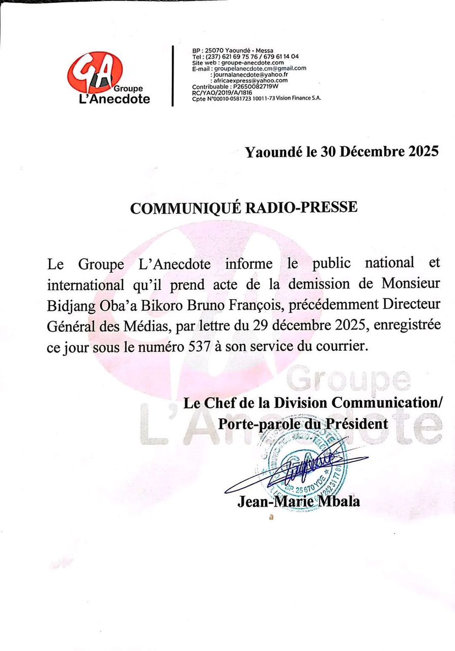 Le directeur général des médias du groupe l’anecdote fondé par le milliardaire Pierre Amougou Belinga, le journaliste Bruno Bidjang a annoncé sa démission ce mardi 30 décembre 2025.